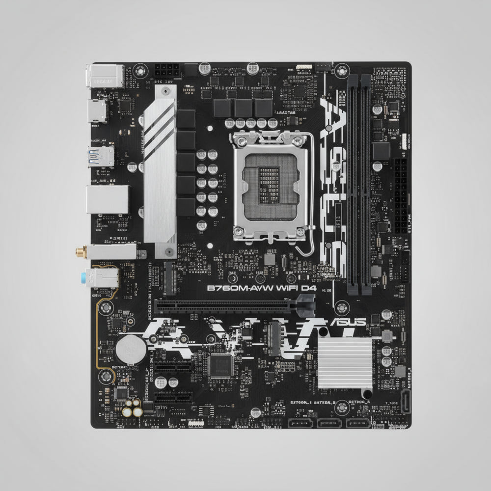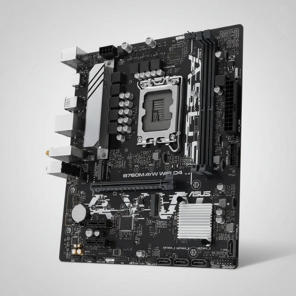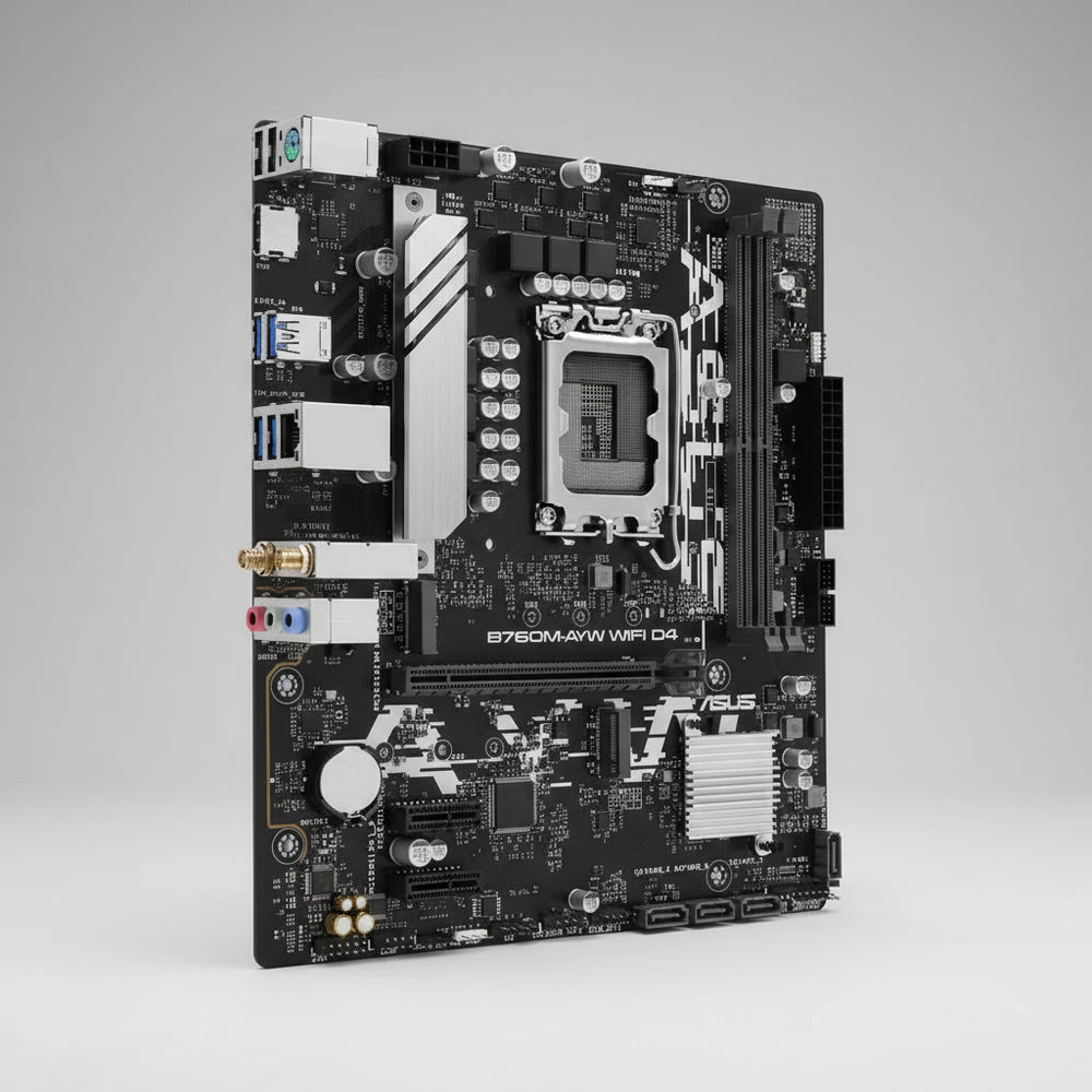 The ASUS B760M-AYW WIFI D4 mATX Motherboard is a high-performance and versatile motherboard designed for Intel 12th, 13th, and 14th Gen processors with the LGA1700 socket. Powered by the Intel B760 chipset, it delivers exceptional stability, connectivity, and performance, making it an ideal choice for gamers, content creators, and professionals seeking reliability in a compact mATX form factor.