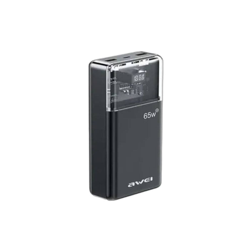The Awei P109K 30000mAh 65W Fast Charging Power Bank is a premium high-capacity charging solution designed for users who need fast, reliable, and efficient power for multiple devices. With its large 30000mAh battery, it provides extended backup for smartphones, tablets, cameras, and even laptops, making it ideal for travel, work, and everyday use. Equipped with PD65W fast charging, it delivers exceptional power output capable of charging laptops and high-demand devices with impressive speed. The Type-C input/output supports up to 65W, ensuring both rapid recharging and powerful output performance, while the USB-A1 and USB-A2 ports offer additional charging options for different devices at optimal voltage levels. The power bank features a one-input and three-output design, allowing multiple devices to charge simultaneously with stable performance. Its semitransparent body adds a modern, stylish aesthetic, and the digital power display keeps you updated with real-time battery information. Compact in size at 158.5 × 69 × 33.5mm, it is easy to carry without compromising charging capability. Whether powering a laptop, boosting a smartphone, or serving as a dependable backup on long trips, the Awei P109K stands out as a powerful, durable, and versatile charging companion.