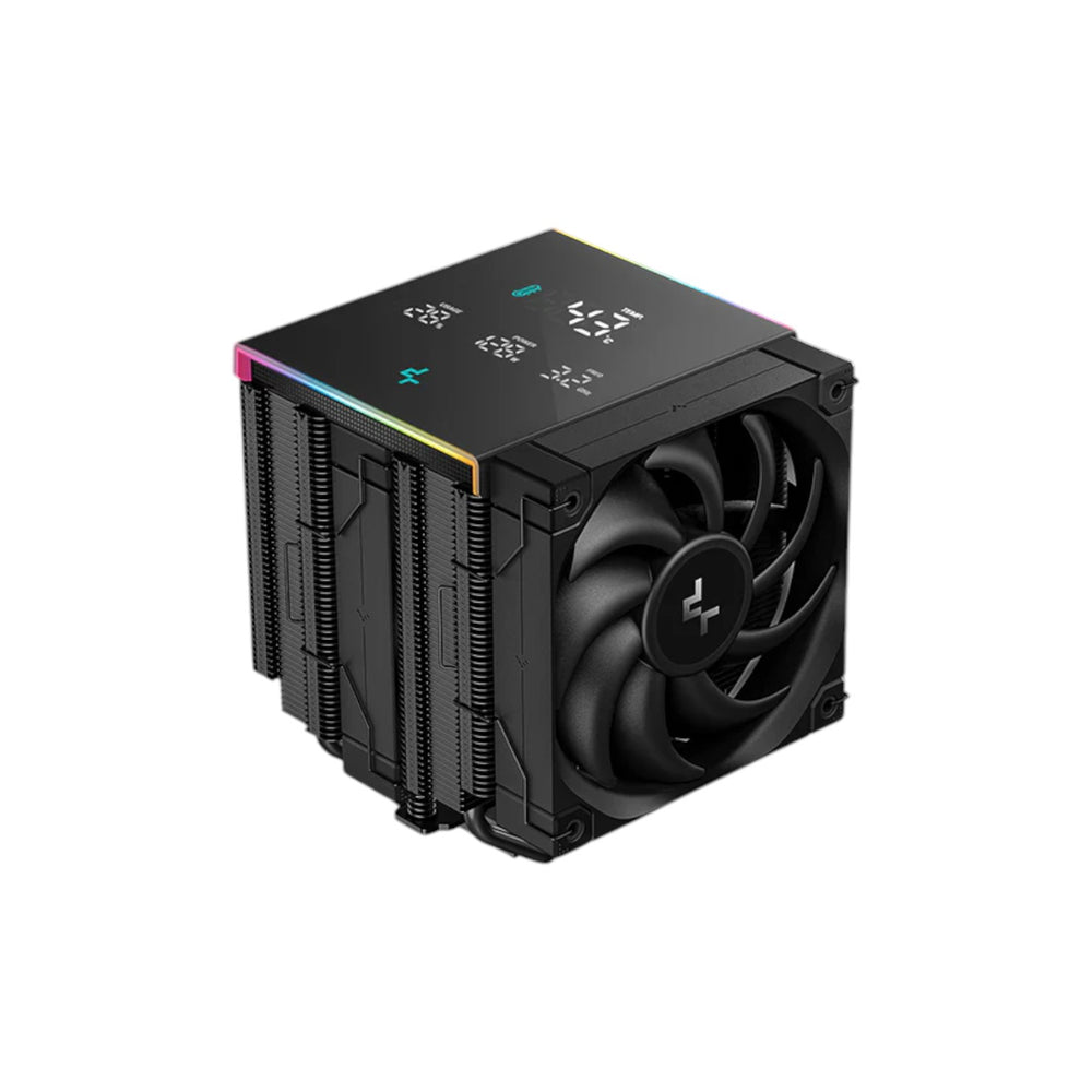 This dual-tower cooler features six premium copper heatpipes and a precision-machined nickel-plated base, ensuring superior heat transfer and stability even under maximum load. Its standout feature is the integrated digital display panel, which provides real-time CPU metrics such as temperature, usage, wattage, and frequency. Powered via USB 2.0 and managed through DeepCool’s dedicated software, this intelligent display gives users instant access to vital system data, combining functionality with modern design.