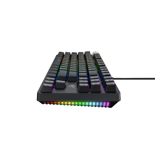 Havit Gamenote KB890L RGB Mechanical Gaming Keyboard The Havit Gamenote KB890L RGB Mechanical Gaming Keyboard is a cutting-edge option for gamers who need style, accuracy, and longevity. With an impressive lifespan of up to 50 million keystrokes, the Blue Switches provide a pleasant click and tactile feedback perfect for typing and gaming. This keyboard is ideal for competitive play with its all-keys roll-over functionality, ensuring every command is registered precisely. The RGB backlighting and blended light elements enhance the visual experience, while the ergonomic design reduces strain during extended gaming sessions. It features a compact 87-key design and is reinforced by a strong metal and ABS frame. The keyboard weighs 834g with dimensions of 358 x 130 x 41mm, making it a great portable option. With a 1.6-meter cable and wired USB interface, it offers stability and fast response times. It provides strong performance while maintaining energy efficiency at 5V and 200mA.