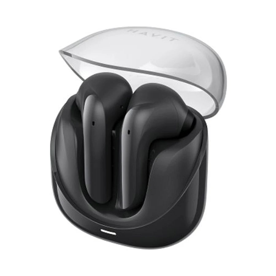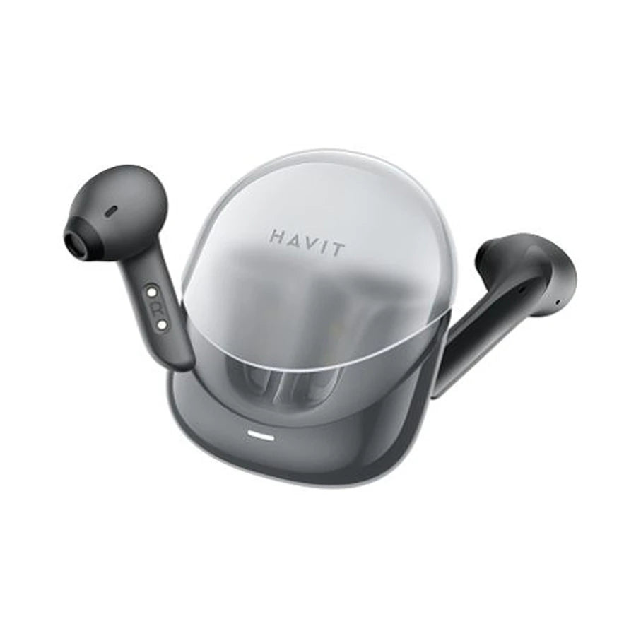 Each earbud has a 25mAh battery, and the 400mAh charging case provides a total playtime of up to 25 hours, with 4.5 hours per single charge. The earbuds support Bluetooth 5.3 for stable connectivity, and include smart touch controls for easy operation, a game mode for low-latency performance, and an IPX4 waterproofing rating to protect against sweat and splashes. With their sleek, translucent black design and compact, ergonomic fit, the Havit Modern Buds combine beauty and functionality, making them ideal for everyday use, outdoor activities, and immersive music experiences.