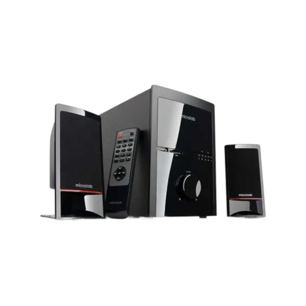 The Microlab M700BT 2.1 Multimedia Bluetooth Speaker is a high-performance audio system designed to elevate your home entertainment experience. With a total RMS output of 46W—featuring 14W x 2 satellite speakers and an 18W subwoofer—it delivers immersive sound with deep, punchy bass and crisp, clear highs. The system includes a 5-inch bass driver and 2.5-inch tweeters, ideal for movies, TV, CDs/DVDs, and MP3/MP4 playback. Its reflex tunnel design enhances low-frequency response across a wide range of 35 Hz–20 kHz, ensuring distortion-free music with a signal-to-noise ratio of 75 dB, channel separation over 45 dB, and only 0.3% harmonic distortion (1W @ 1kHz). Equipped with Bluetooth, USB, SD card support, 3.5mm stereo, and 2RCA inputs, this Microlab speaker offers versatile connectivity. Additional features include a wireless remote and an FM radio tuner with a telescopic antenna. The subwoofer’s robust MDF and plastic construction, along with the sleek black finish, adds durability and style.