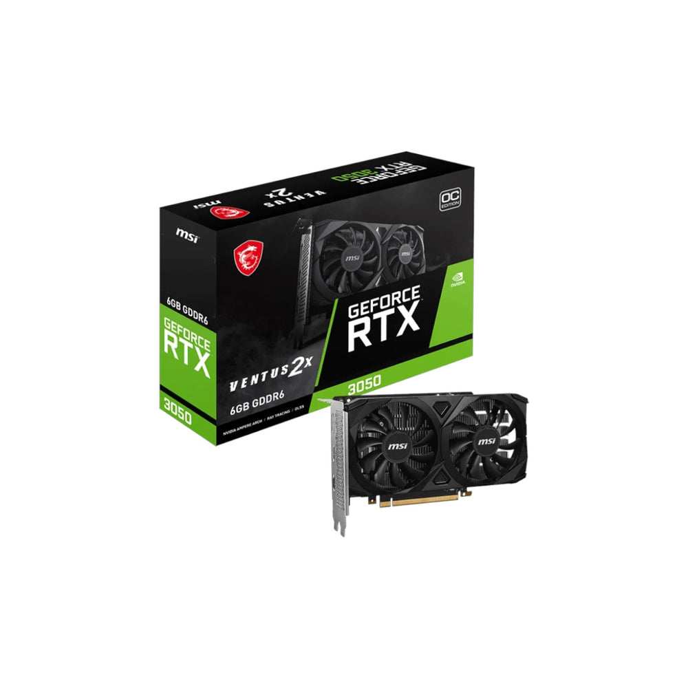 The MSI GeForce RTX 3050 VENTUS 2X E 6G OC GDDR6 Graphics Card is built to deliver smooth and efficient 1080p gaming performance with modern NVIDIA Ampere architecture features in a compact and reliable design. Equipped with 2304 CUDA cores and 6GB of high-speed GDDR6 memory on a 96-bit interface, this graphics card ensures responsive gameplay, faster rendering, and stable frame rates in popular games and creative applications. With support for real-time ray tracing and AI-enhanced graphics powered by second-generation RT Cores and third-generation Tensor Cores, it brings realistic lighting, shadows, and improved visual quality to supported titles. The dual-fan VENTUS 2X cooling system maintains optimal thermal performance while keeping noise levels low, making it well-suited for compact or quiet PC builds. Featuring PCIe 4.0 connectivity along with HDMI 2.1 and DisplayPort outputs, it supports high-resolution displays and smooth multi-monitor setups. Designed for efficiency with modest power requirements, the MSI RTX 3050 VENTUS 2X E 6G OC is an excellent choice for gamers and creators seeking dependable next-generation performance in a budget-friendly graphics solution.