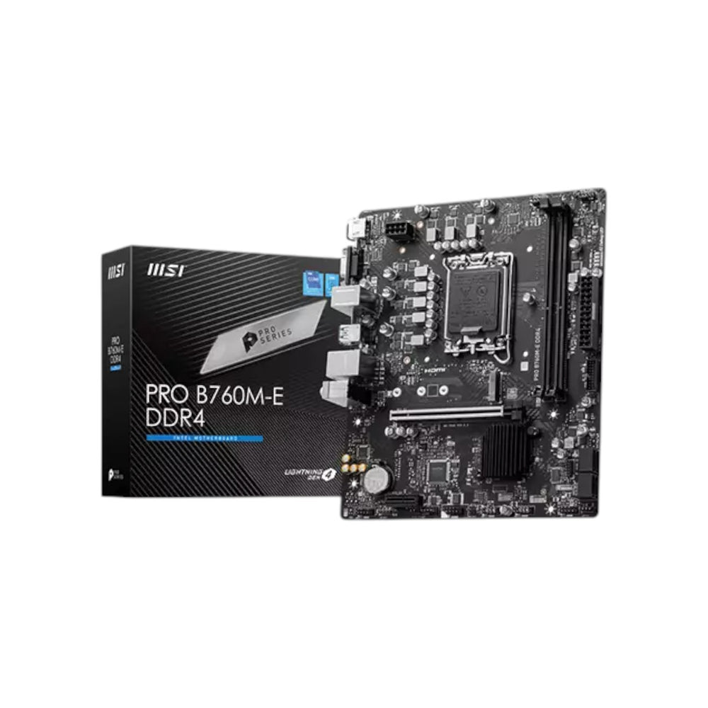 The MSI PRO B760M-E DDR4 mATX Motherboard is a powerful and efficient foundation for modern Intel-based systems, offering a perfect blend of performance, reliability, and value. Designed with the LGA 1700 socket, it supports 14th, 13th, and 12th Generation Intel Core, Pentium Gold, and Celeron processors, ensuring compatibility across a wide range of builds.