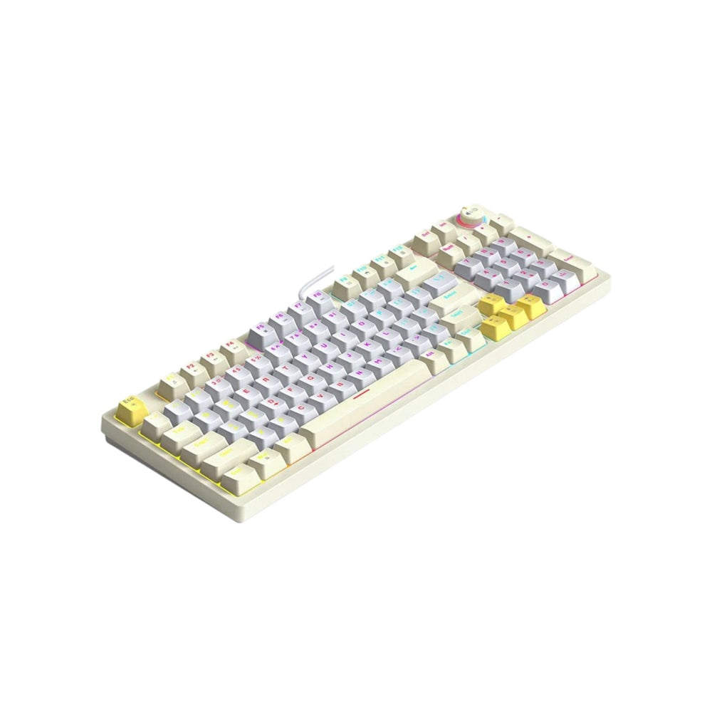 The T-Wolf T50 Wired RGB Mechanical Gaming Keyboard is built for gamers who value precision, durability, and style. Featuring 97 keys with a dedicated knob, it offers a versatile layout for gaming and productivity. The blue mechanical switches provide tactile feedback with an audible click, delivering a responsive and satisfying typing experience.