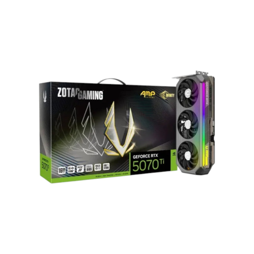 The ZOTAC GAMING GeForce RTX 5070 Ti AMP Extreme INFINITY 16GB GDDR7 Graphics Card is a flagship-class graphics solution designed for gamers and creators who demand extreme performance, advanced cooling, and striking visual aesthetics. Powered by NVIDIA’s latest Blackwell architecture and enhanced with DLSS 4 technology, this graphics card delivers outstanding AI-accelerated performance, real-time ray tracing, and ultra-smooth gameplay across modern AAA titles and professional creative workloads. It features an impressive 8960 CUDA cores paired with 16GB of ultra-fast GDDR7 memory running on a 256-bit memory interface at 28 Gbps, ensuring massive bandwidth for high-resolution textures, complex rendering, and intensive multitasking. The factory-tuned AMP Extreme edition operates at high engine clock speeds to deliver responsive frame rates and exceptional processing power. To maintain peak performance under heavy loads, the card is equipped with ZOTAC’s advanced IceStorm 3.0 cooling system featuring a larger vapor chamber, BladeLink fans, FREEZE Fan Stop technology, and dual BIOS support for performance or silent operation. The AMP Extreme INFINITY design is enhanced with SPECTRA 2.0 RGB lighting and SPECTRA LINK synchronization, allowing full aesthetic customization, while a reinforced die-cast metal backplate and included GPU support bracket ensure long-term durability and structural stability. Built on the PCI Express 5.0 interface, this graphics card offers future-ready connectivity and fast data transfer speeds. It supports cutting-edge display output with three DisplayPort 2.1b ports and one HDMI 2.1b port, enabling ultra-high refresh rate 4K gaming and immersive 8K HDR visuals with multi-display support. Supporting Microsoft DirectX 12 Ultimate and OpenGL 4.6, the ZOTAC GAMING GeForce RTX 5070 Ti AMP Extreme INFINITY is a premium upgrade for high-end gaming rigs and professional workstations that demand uncompromising performance, cooling efficiency, and visual impact.